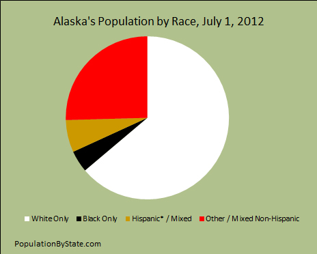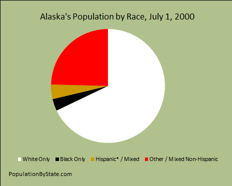 | Population Density Map of Alaska by Square Mile Darker orange color indicates areas of higher population density. The race percentages for Alaska have changed some from 2000 to 2012. The percentage of the population of white only has decreased from 67.9 to 63.8. The percent of the black only population has only slightly increased from 3.4 to 4.3. The percent of population of hispanics/mixed has increased from 4.1% to 6.4% and other/mixed races have increased from 24.6% to 25.4%.